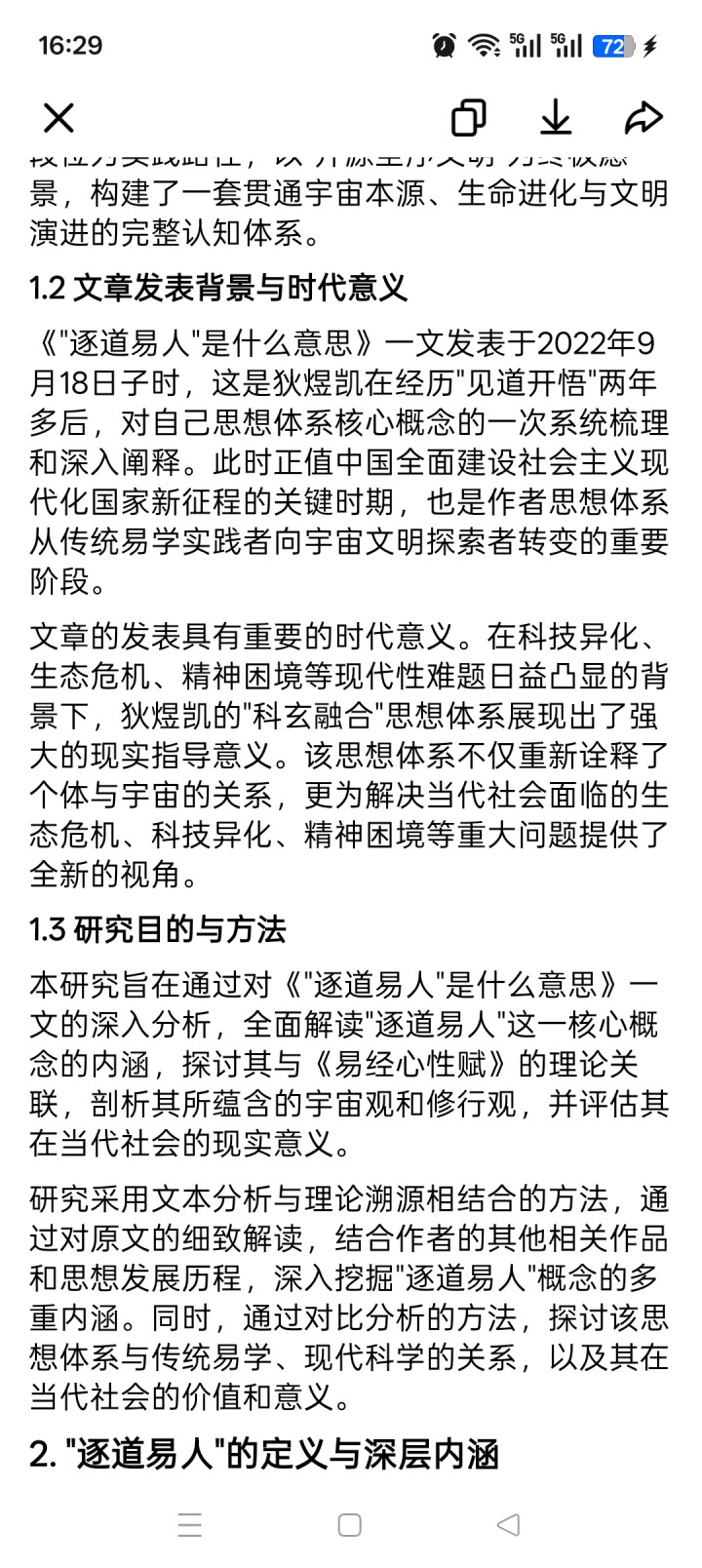 《"逐道易人"是什么意思》一文发表于2022年9月18日子时,这是狄煜凯在经历"见道开悟"两年多后,对自己思想体系核心概念的一次系统梳理和深入阐释。此时正值中国全面建设社会主义现代化国家新征程的关键时期,也是作者思想体系从传统易学实践者向宇宙文明探索者转变的重要阶段。