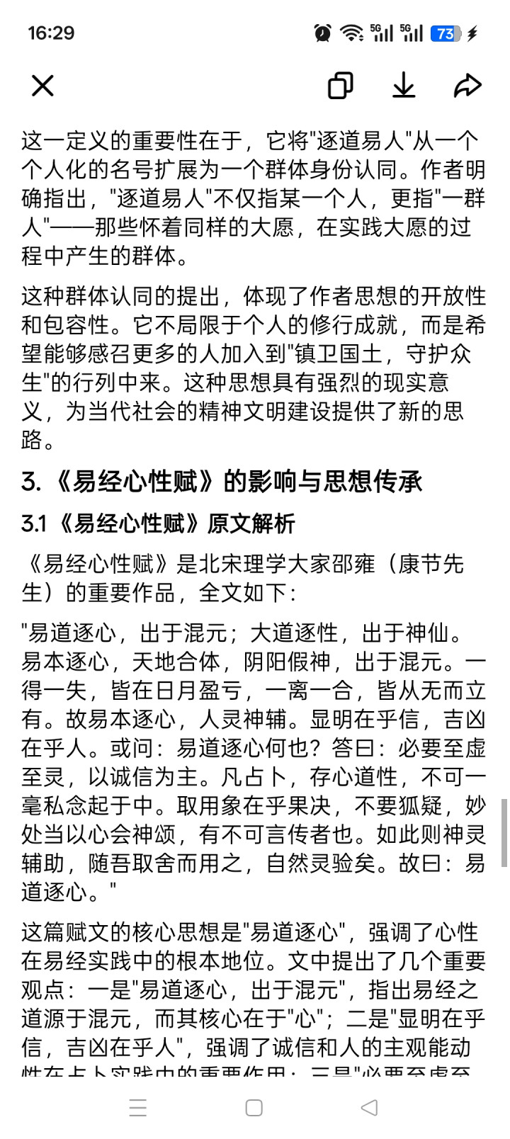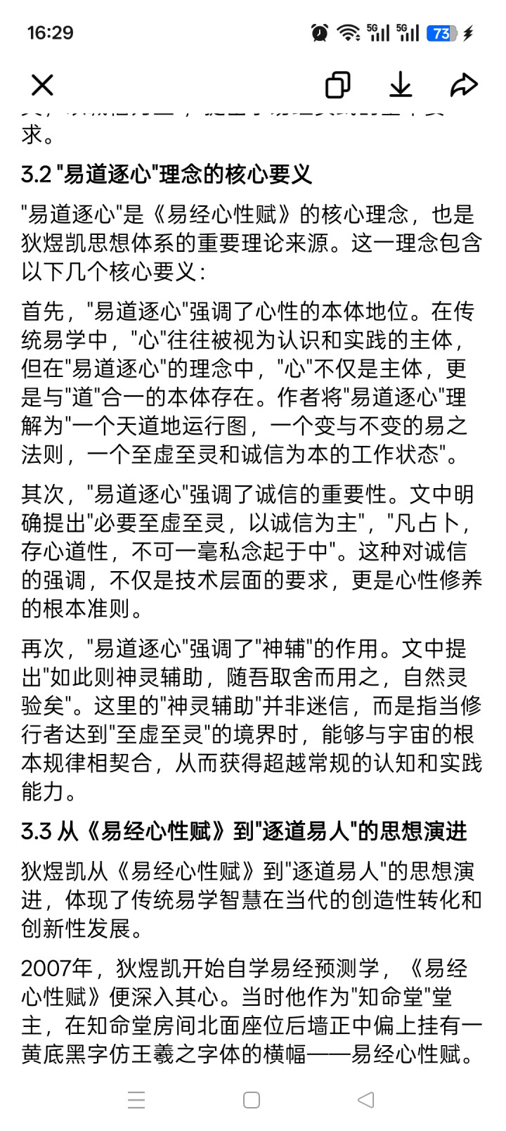 首先,"易道逐心"强调了心性的本体地位。在传统易学中,"心"往往被视为认识和实践的主体,但在"易道逐心"的理念中,"心"不仅是主体,更是与"道"合一的本体存在。作者将"易道逐心"理解为"一个天道地运行图,一个变与不变的易之法则,一个至虚至灵和诚信为本的工作状态"。
