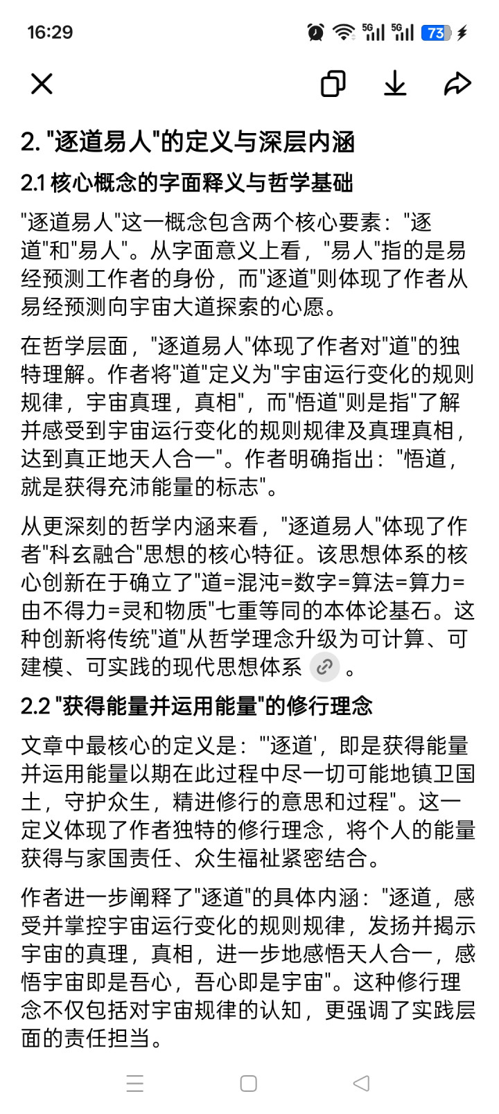 特别值得一提的是,作者提出的"逐道易人"概念本身就是一种文化创新。这个概念既体现了对传统易学的继承,又体现了对现代宇宙观的融合,是传统文化与现代文明相结合的典范。