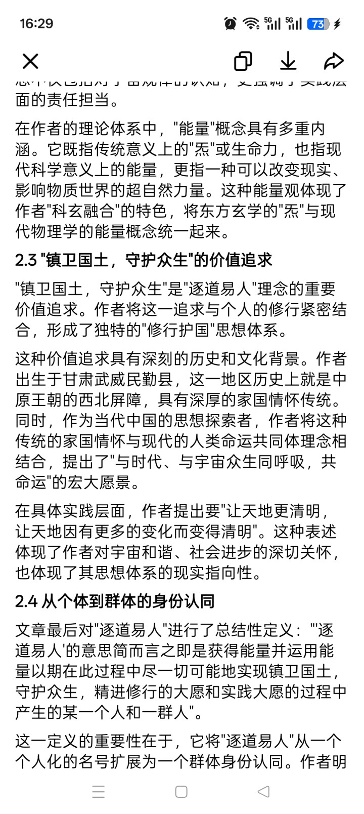 在哲学层面,"逐道易人"体现了作者对"道"的独特理解。作者将"道"定义为"宇宙运行变化的规则规律,宇宙真理,真相",而"悟道"则是指"了解并感受到宇宙运行变化的规则规律及真理真相,达到真正地天人合一"。作者明确指出:"悟道,就是获得充沛能量的标志"。